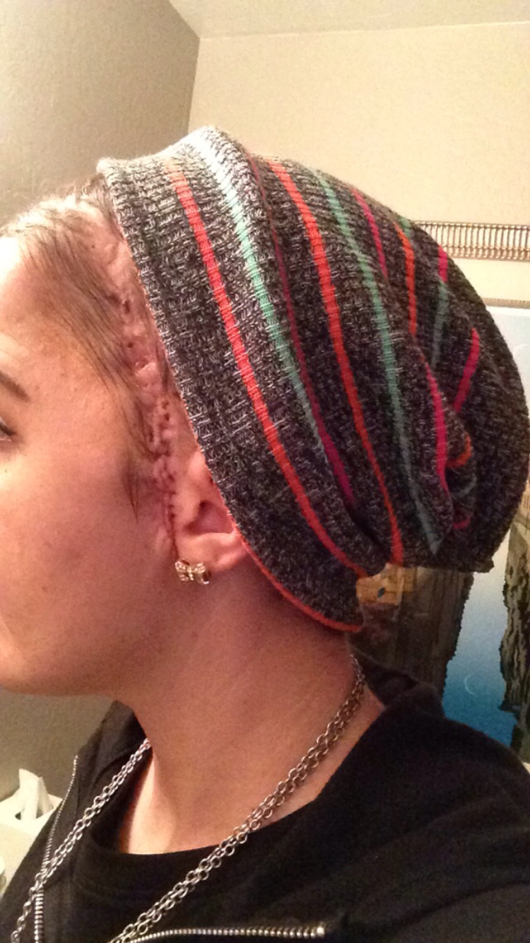 | Right after surgery they had the incision covered. (And stapled to my head again) |